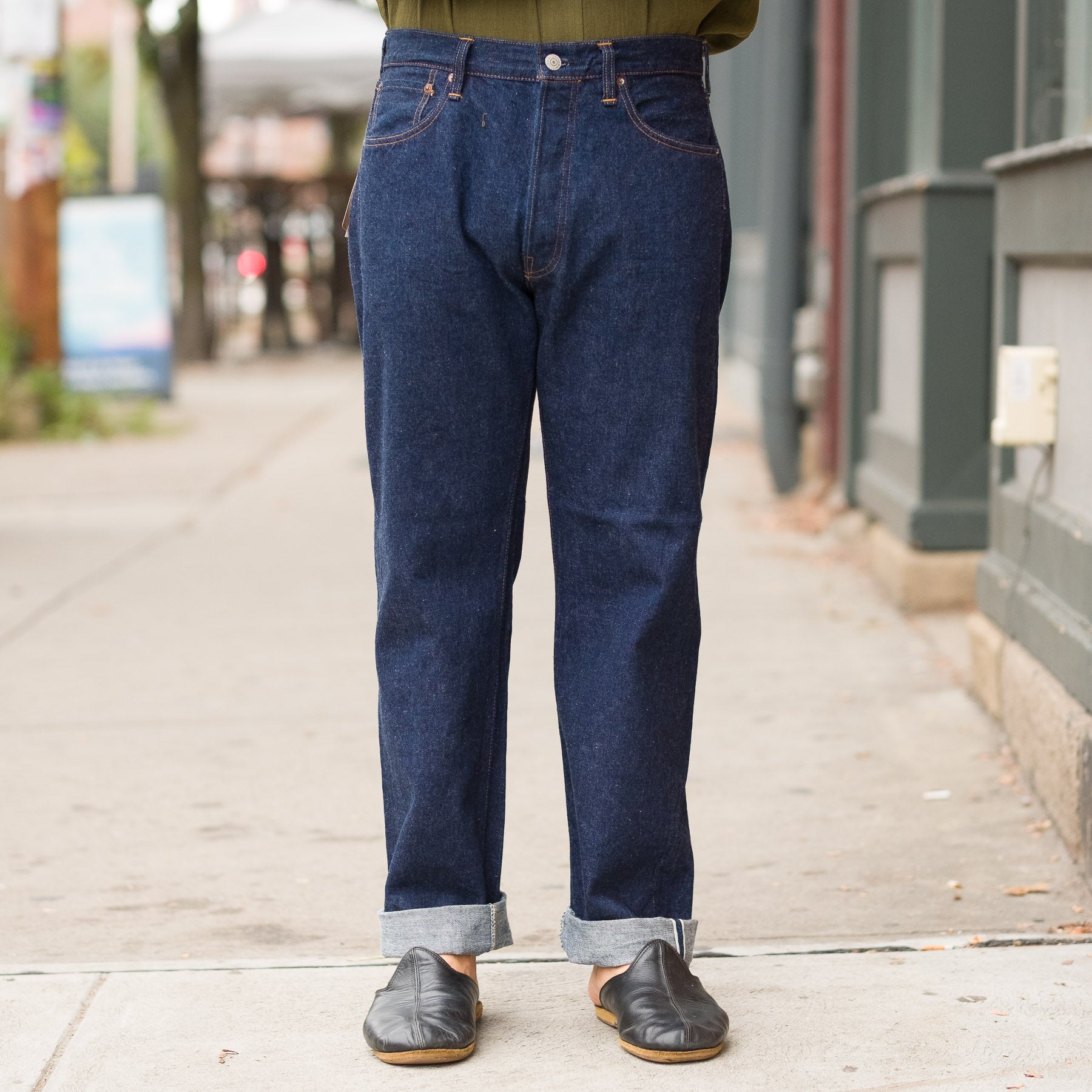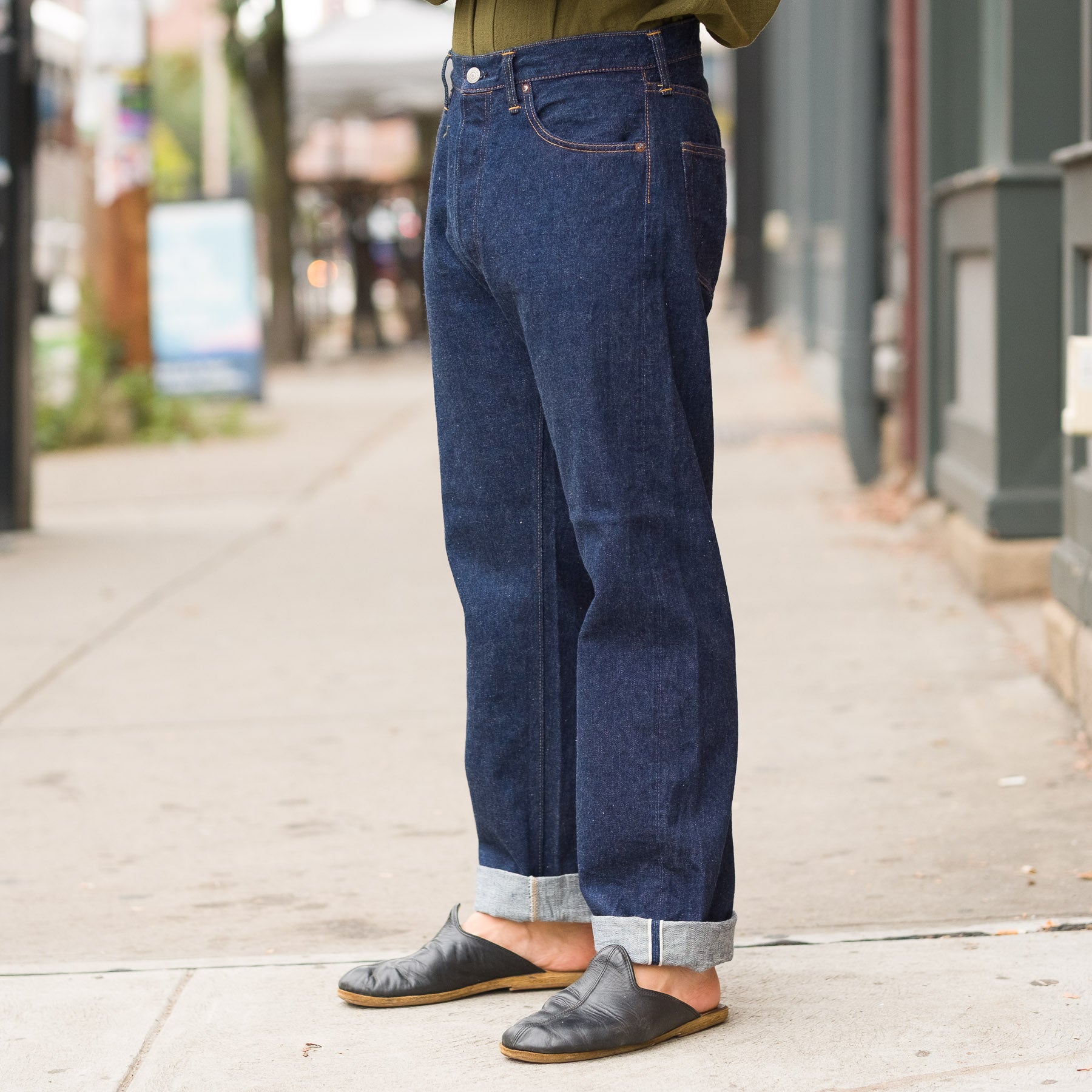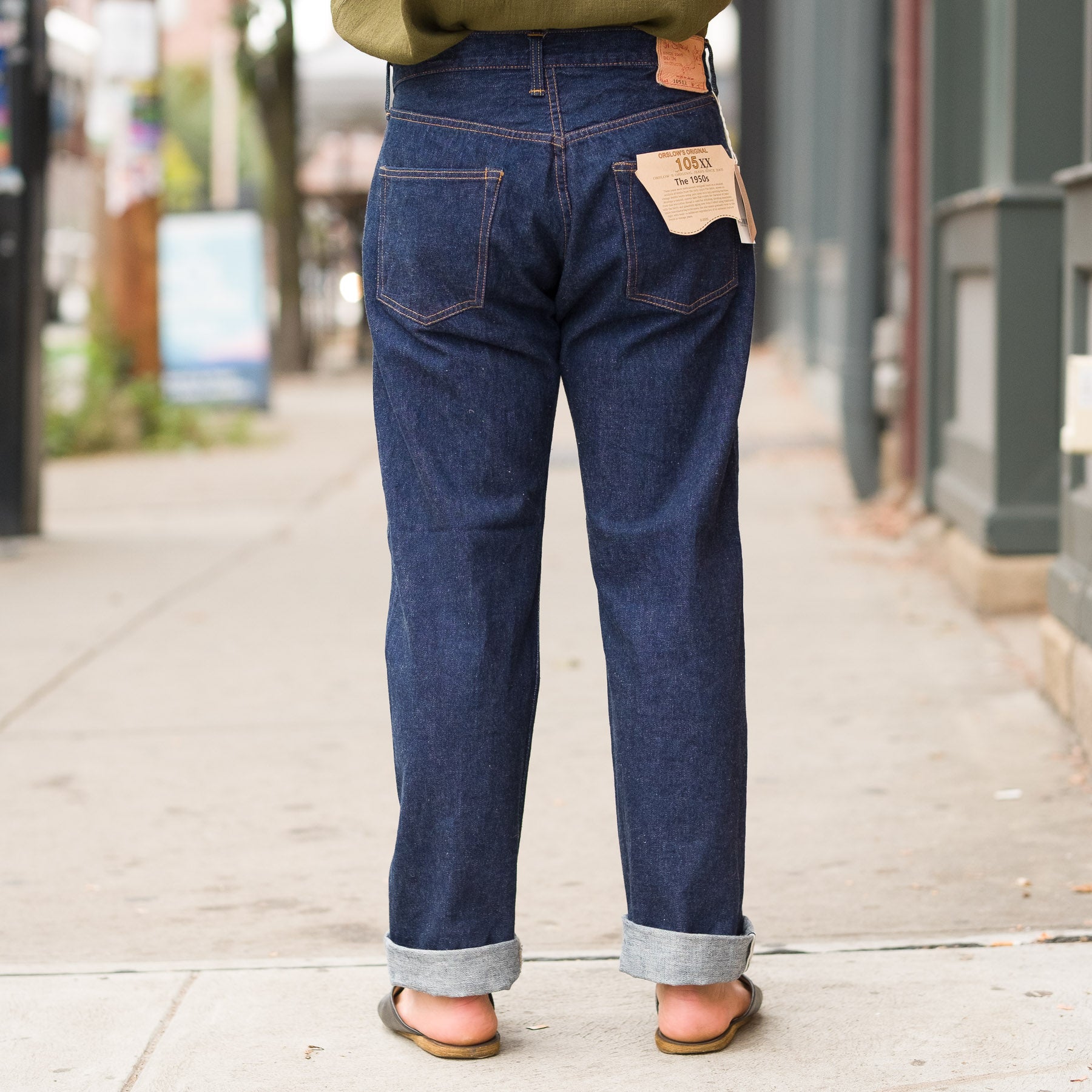 Compared to the Standard 105, the denim on the 105xx pair is slightly softer and has a lighter hand feel, modeled after the denim of the 50s, and features an offset back belt loop. The fit itself is slightly looser than the standard 105. The denim itself is made of yarn that is spun on a machine from 1953, and the jeans are modeled of those from the 50s, and is designed to age as such.